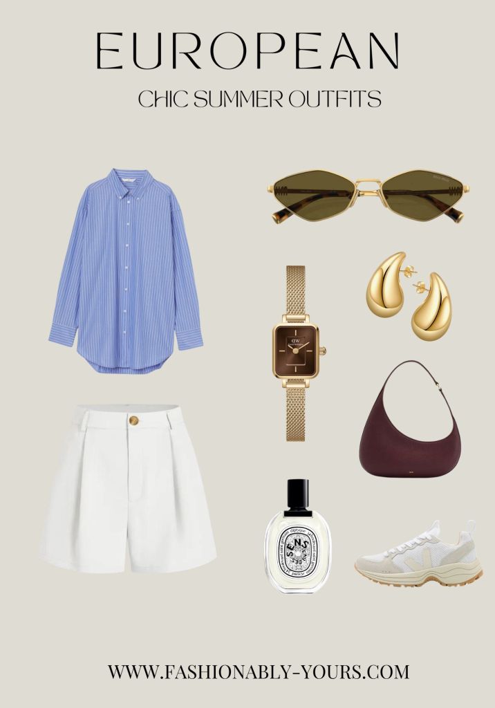Every European wardrobe needs a light blue button-down shirt and a pair of white shorts. Pair these two together with an elegant brown bag, and you have the perfect timeless outfit for Europe.