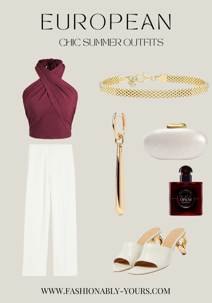 Halter tops paired with wide-leg pants are perfect for your European summer trip, seamlessly blending chic style with a touch of elegance. The signature neckline on a halter top beautifully showcases your shoulders and back, showing off your new holiday tan.