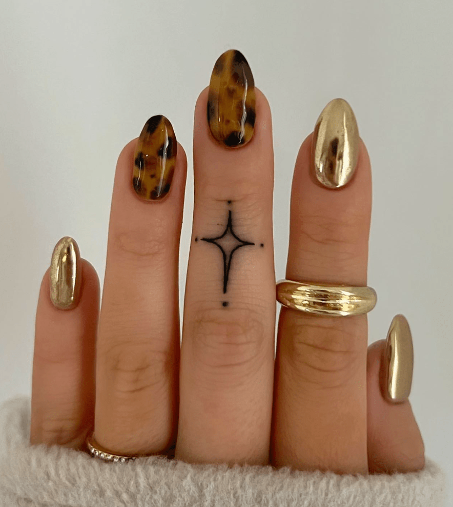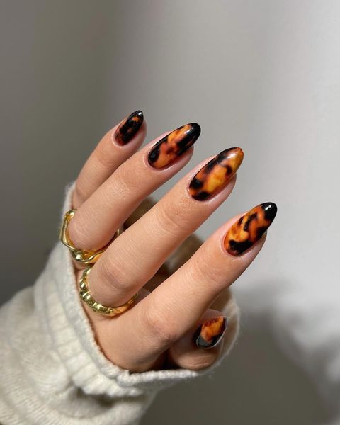 When I saw the tortoise shell nail look on Hailey Bieber last fall, I was instantly obsessed. The contrast between the deep brown and lighter caramel shades is absolutely stunning, making it the perfect design for anyone who wants to embrace the fall aesthetic without settling for a single solid color. This fun pattern is sure to get lots of compliments. Head to the salon and show them these pictures, or learn how to recreate the look at home with this article.