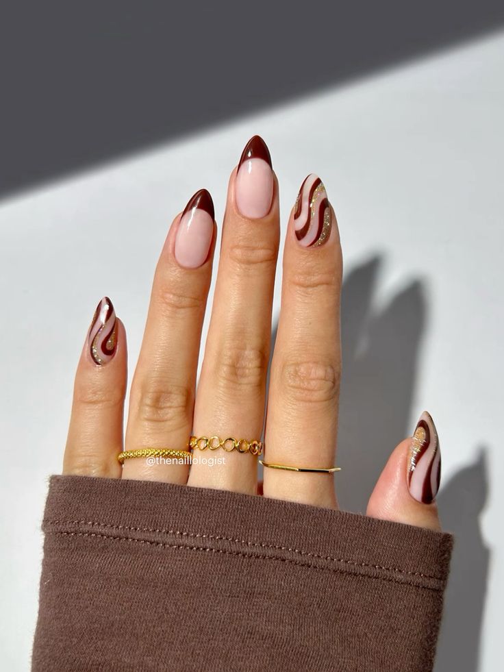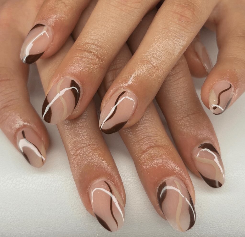 Brown Swirl nails are such a fun look for fall! The mix of warm tones with swirling designs creates a stunning marble-like effect that adds a unique twist to traditional solid colors. While this look can be done with any shade, the rich browns are especially perfect for capturing that cozy, autumn vibe. I especially love the two designs pictured below for this trend!