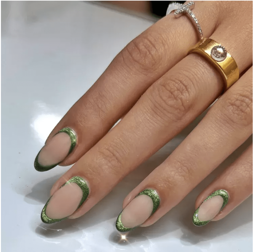 Are you someone who typically loves a subtle nail look, but also want to try a more edgy look this new year? One way to spice up a simple manicure is to add a glitter frame around the border of the nail! This detailing is a modern beauty trend that I think we will see a lot more of in 2025. You can choose any glitter color to match your outfit.