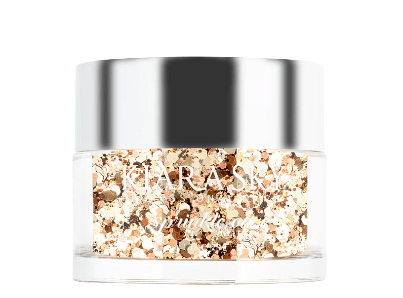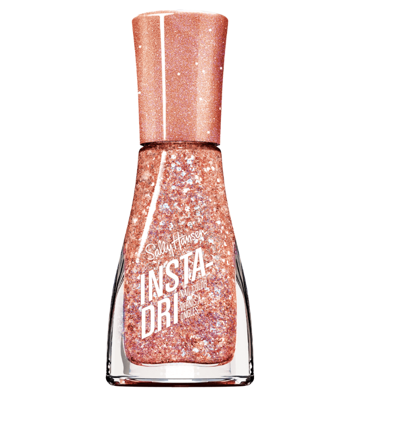 The key to this look is a chunky glitter polish. Two of my favorite chunky glitter polishes you can use for the border of your nails are the Kiara Sky gold sprinkle glitter in the shade ‘Deja Brew,’ and Sally Hansen’s Insta Dri polish in the shade ‘Shooting Star.’