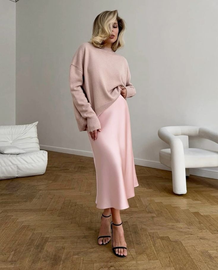 One of my favorite pairings for a stylish yet cozy look is a soft sweater teamed with a flowing satin skirt. As shown above, you can create a gorgeous all-pink version of this combo to fully embrace the Valentine’s Day theme!