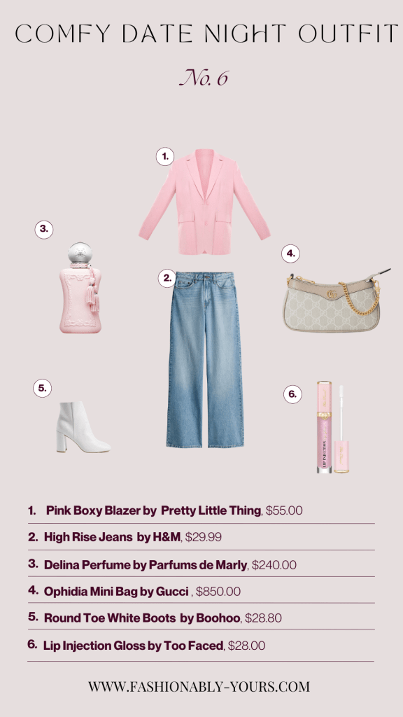There’s no rule saying you have to dress fancy just because it’s Valentine’s Day. Being chic and well-dressed does not have to equate to an expensive dress or jumpsuit. You can be cozy and chic in a pair of jeans! If you want a more casual day or night look, consider pairing jeans with a casual top and a nice pink blazer.