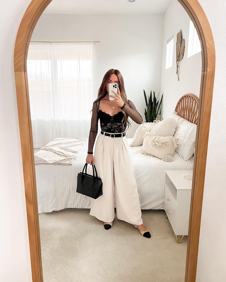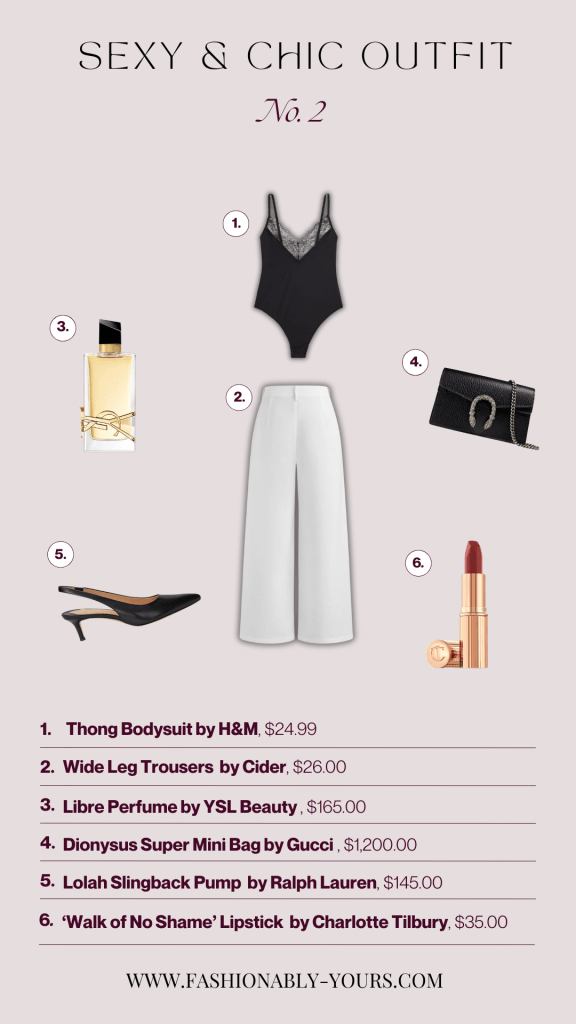Valentine’s Date night outfits are the perfect time to wear an outfit that is both sexy and chic. One of the best pairings you can do for date night is a nice wide leg pant paired with a sexy lace bodysuit. Top this off with a nice pair of heels and a bag, and you have the ultimate sexy and chic outfit.